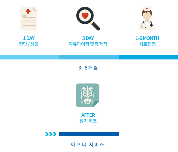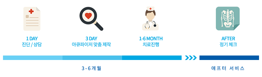 개개인의 상태에 따라 치료 기간은 차이가 있지만 보통 3-6개월의 시간 내에 효과가 나타나며, 1년 - 1년 6개월 동안 내원하며 정기적으로 상태를 체크하는 기간이 필요합니다.